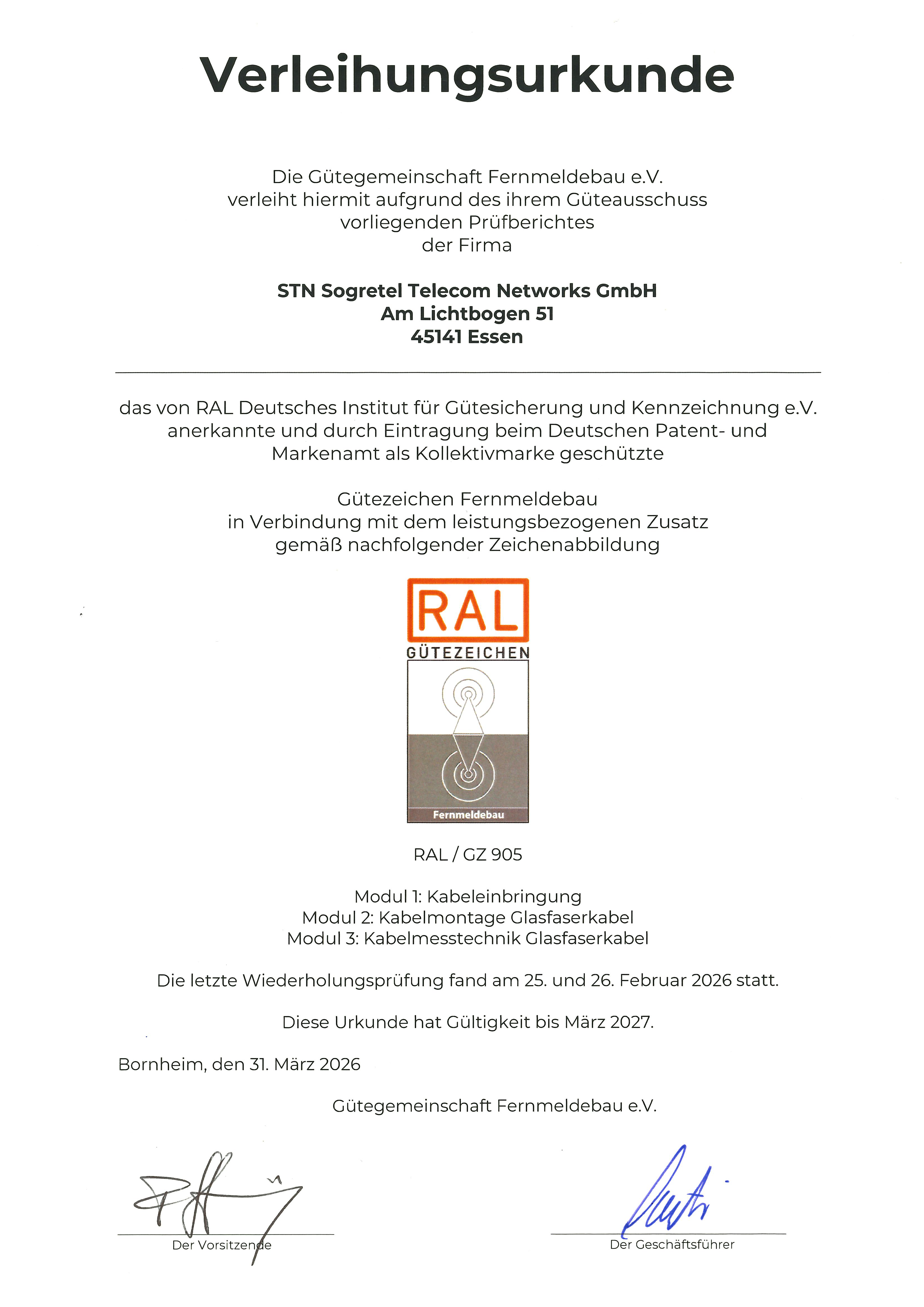 Die STN Sogetrel Telecom Networks GmbH steht seit Jahrzehnten für Kompetenz und Innovation in der Telekommunikations- und Infrastrukturbranche. Als herstellerunabhängiger Dienstleister bieten wir maßgeschneiderte Lösungen in den Bereichen Planung, Aufbau, Installation, Inbetriebnahme und Instandhaltung von Festnetz- und Mobilfunkinfrastrukturen. Unser Leistungsspektrum erstreckt sich von der Tiefbauplanung über Kabelverlegung bis hin zu komplexen Projekten im Bereich der strukturierten Gebäudeverkabelung und Funkversorgung.